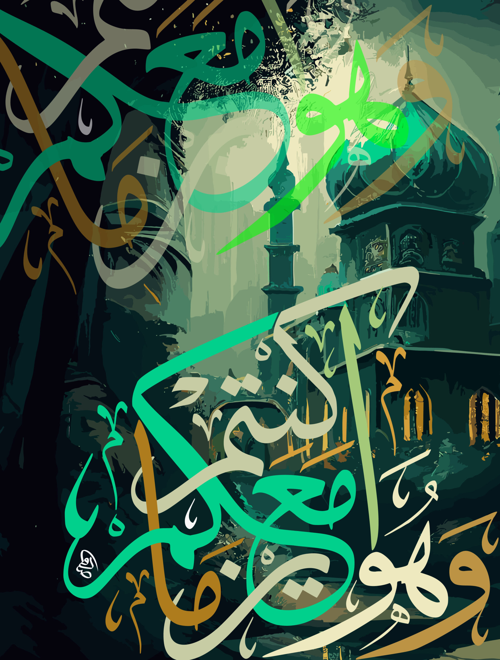 The artwork features dynamic, expressive calligraphy in a modern, abstract style, with flowing green and gold/kuning lines that create depth and energy. The design uses rich color layering and textural overlays, set against a subtle background hinting at a mosque interior, combining traditional Islamic spirituality with a contemporary aesthetic.