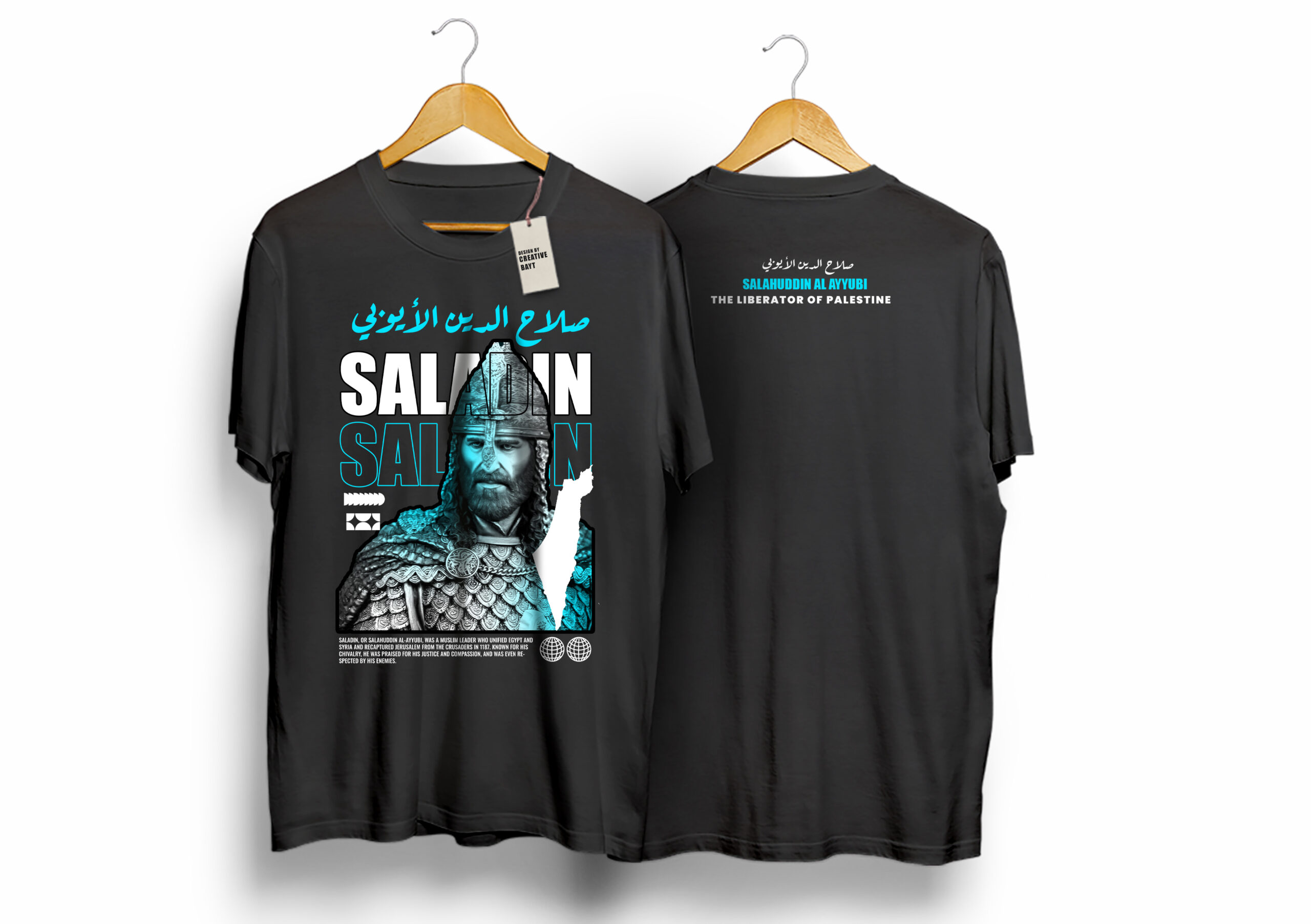 The artwork features a high-contrast, stylized portrait of Saladin, presented as a powerful cultural and historical icon. The graphic is perfectly suited for high-impact apparel and merchandise.
