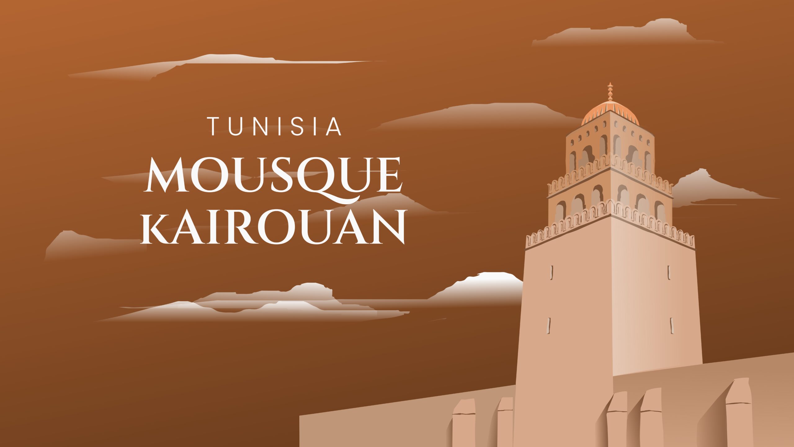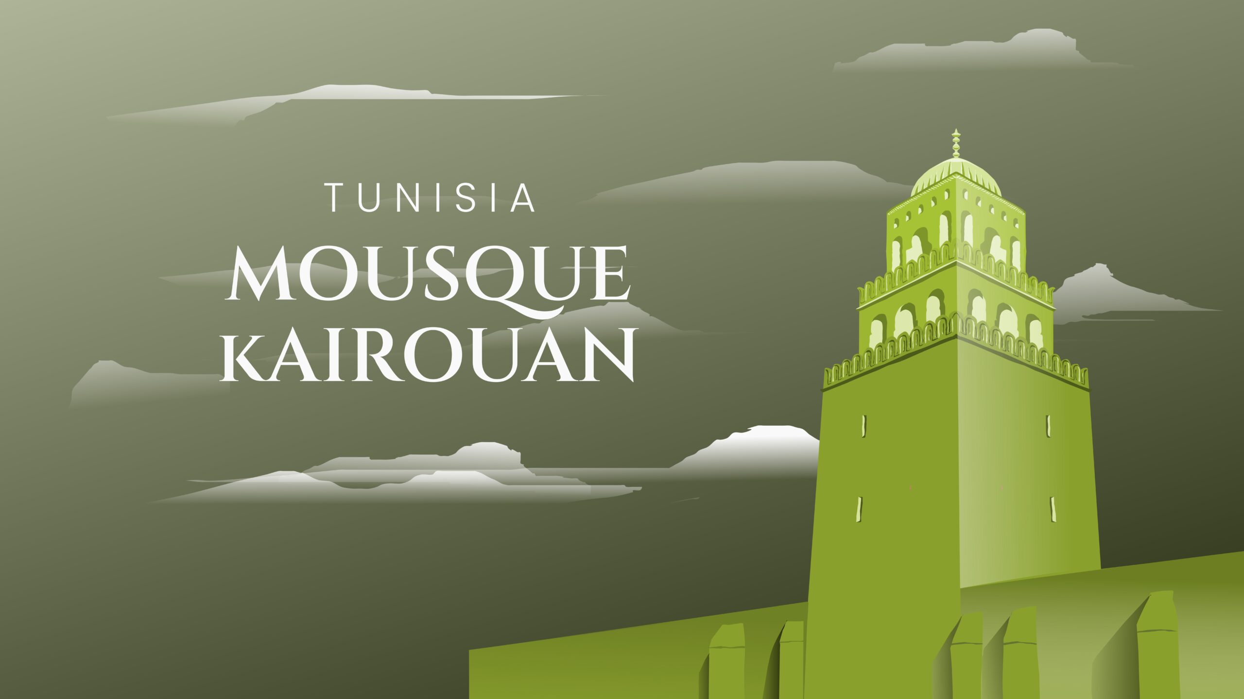 A stylized digital vector illustration of the iconic Minaret of the Great Mosque of Kairouan (Mousque Kairouan), one of the oldest and most important mosques in North Africa, located in Tunisia.